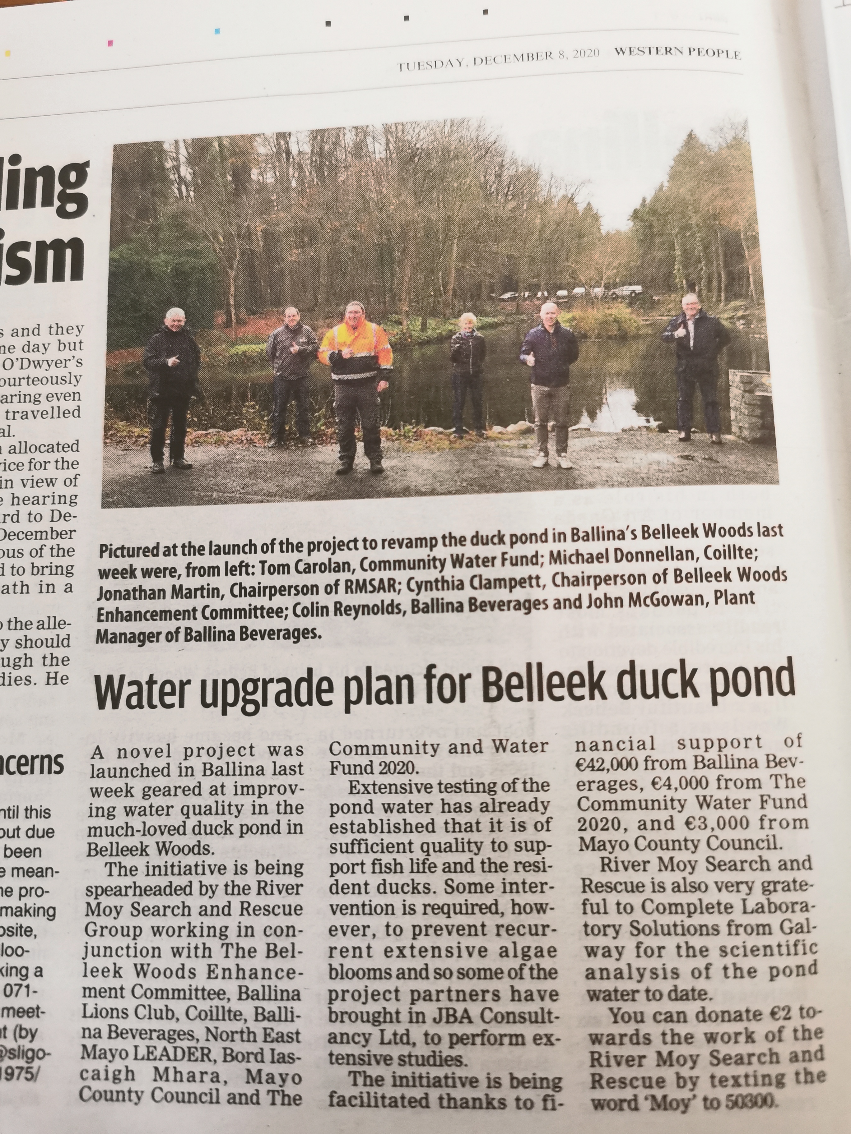 In May 2021, after a lot of fundraising, River Moy Search and Rescue Ballina commissioned an environmental study to understand how to combat the annual summer algae blooms in the beautiful Belleek Woods Duck Pond.